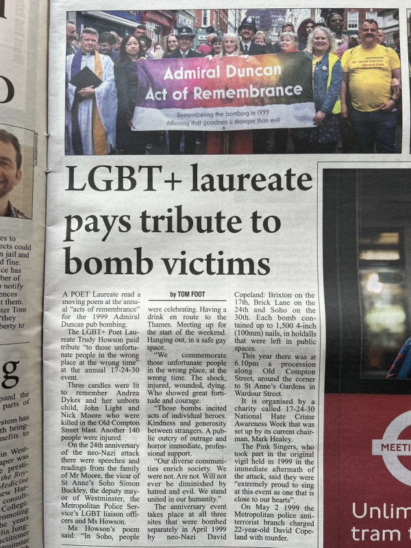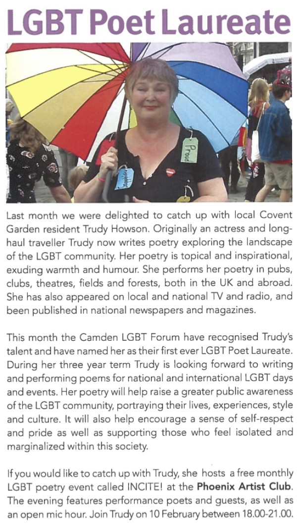 Trudy was appointed LGBT Poet Laureate in February 2016 for an initial term of three years. This inaugural post was devised by Camden LGBT Forum to promote LGBT poetry in London and the UK.