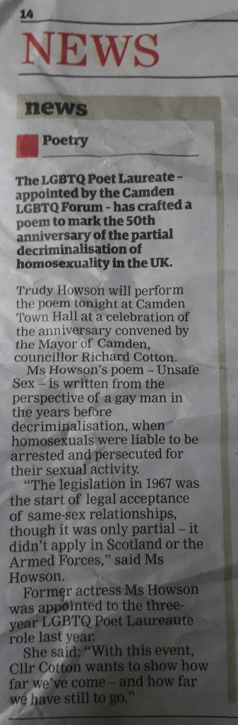 Thank you to Josh from Ham & High for heralding in the anniversary of the Sexual Offences Act with this piece on my performance at the Town Hall, in July 2017.